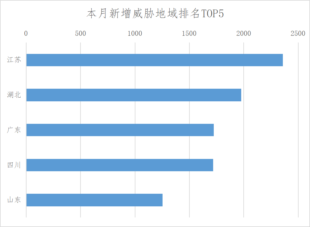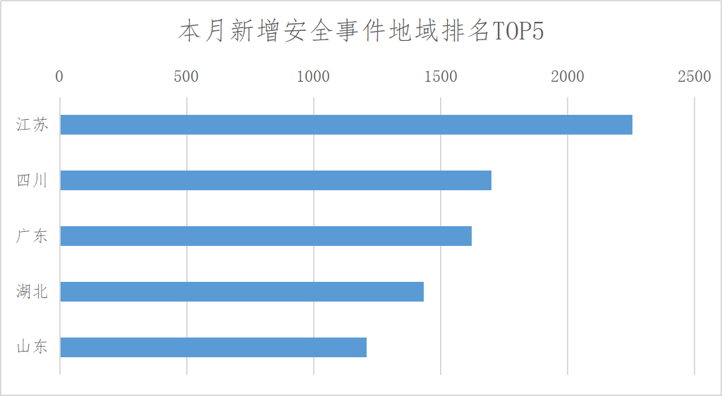 本月新增安全事件数量居前五位的省份为江苏省、四川省、广东省、湖北省和山东省,分别占比9.02%、6.79%、6.49%、5.73%和4.83%。本月新增安全事件地域分布及排名情况如图10所示。