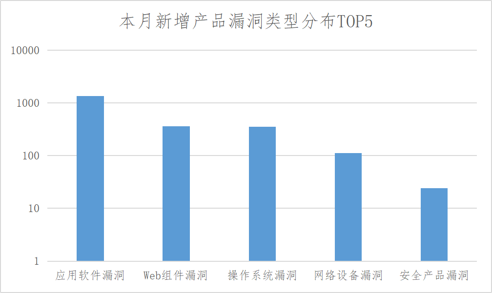 本月平台收集的产品漏洞占安全隐患总量的57.08%;产品漏洞以应用软件漏洞为主,占比为59.39%,Web组件漏洞、操作系统漏洞、网络设备漏洞占比分别为17.91%、11.02%和5.82%。本月新增产品漏洞类型分布情况如图7所示。