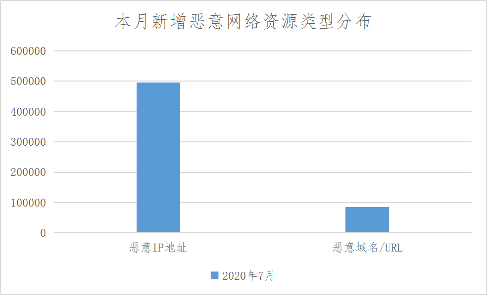 本月平台新增恶意网络资源中,恶意IP地址数量占比为85.23%;恶意域名/URL数量占比为14.77%。本月新增恶意网络资源类型分布情况如图4所示。