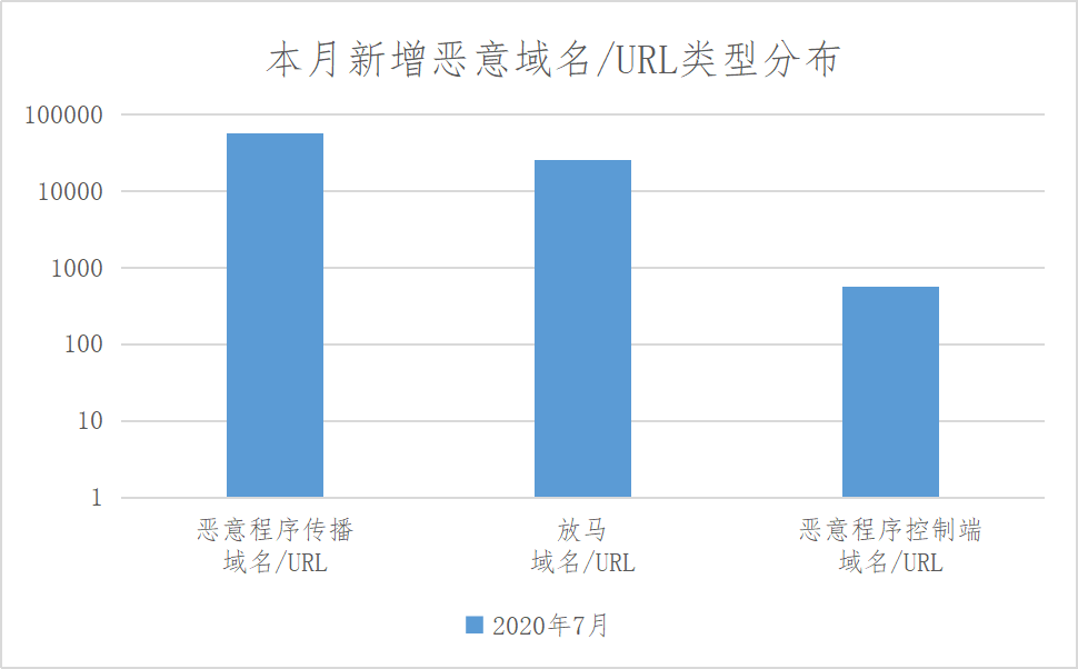 本月新增恶意域名/URL类型主要为恶意程序传播域名/URL和放马域名/URL,占比分别为65.33%和29.77%。恶意程序传播域名/URL和恶意程序控制端域名/URL数量较6月份有所增长,但恶意程序仍然是网络攻击过程中使用的主要工具和手段。本月主要新增恶意域名/URL类型分布情况如图6所示。