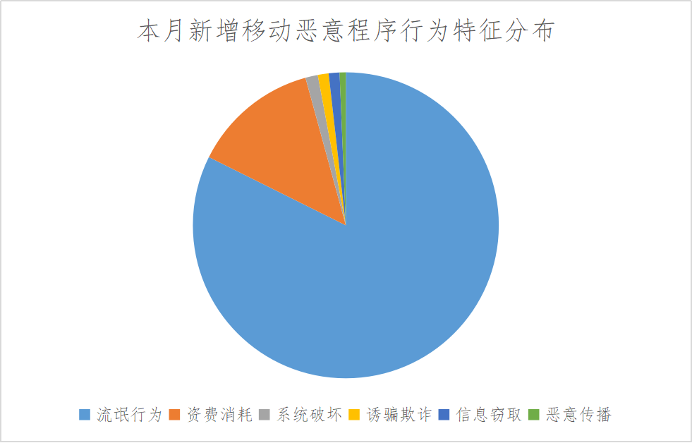 本月新增移动恶意程序行为特征主要包括流氓行为、资费消耗行为、系统破坏行为、诱骗欺诈行为、信息窃取行为和恶意传播行为。其中,流氓行为和资费消耗行为占比较高,分别为82.35%和13.40%。本月新增移动恶意程序行为特征分布情况如图9所示。