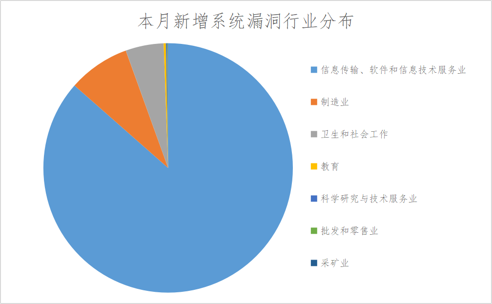 本月新增系统漏洞数量占安全隐患总量的42.92%,主要分布在信息传输/软件和信息技术服务业、制造业、卫生和社会工作、教育和科学研究与技术服务业等行业。本月新增系统漏洞行业分布情况如图8所示。