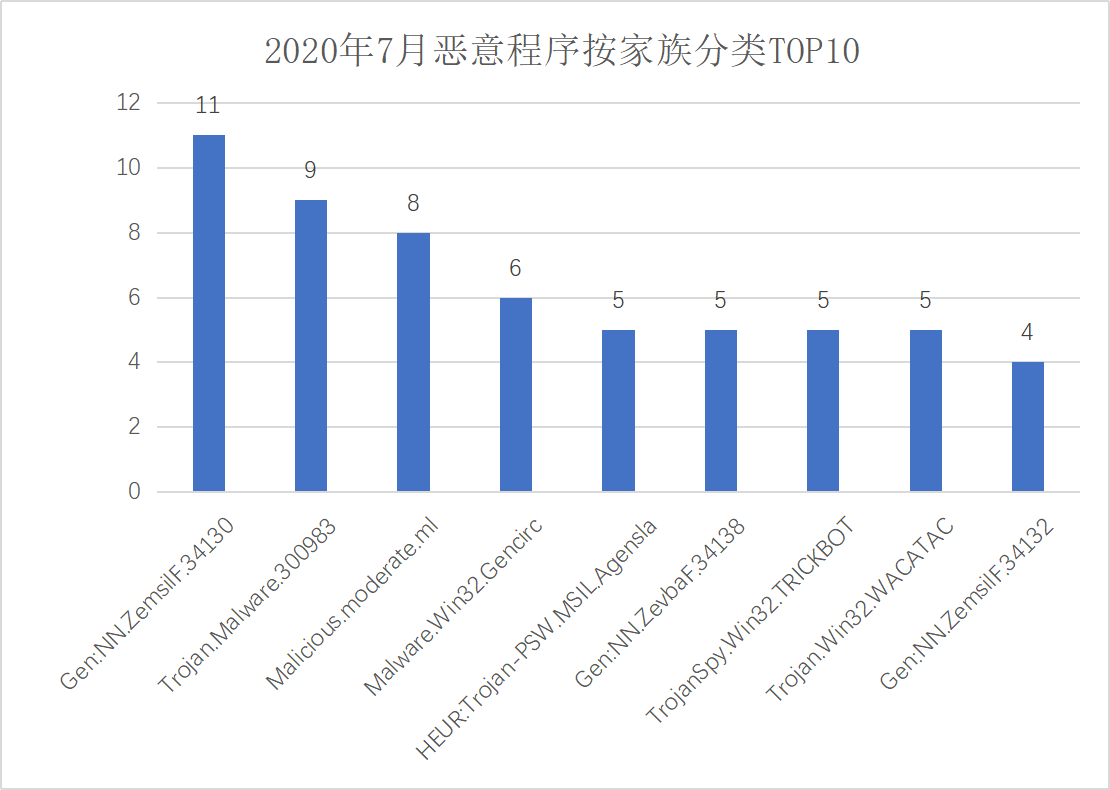 2020年7月共收录恶意程序150个,数量较上月增加0.67%。恶意程序按家族分类共有73个家族,主要家族有Gen:NN.ZemsilF.34130,Trojan.Malware.300983,Malicious.moderate.ml等,其中Gen:NN.ZemsilF.34130家族居多,数量为11个。详情见下图1-1。