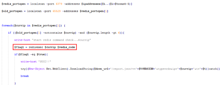 对6379端口进行探测为redis服务,在函数redisexec中尝试连接未设置密码的redis服务器,访问成功后执行远程命令: